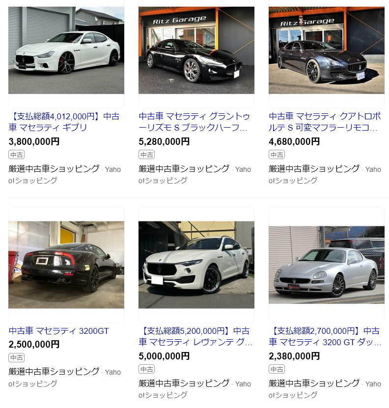 下記の画像は、ヤフーショッピングで「マセラティ 中古車」で検索した結果のページを適当に切り取ったものです。≫ ヤフーショッピング「マセラティ 中古車」